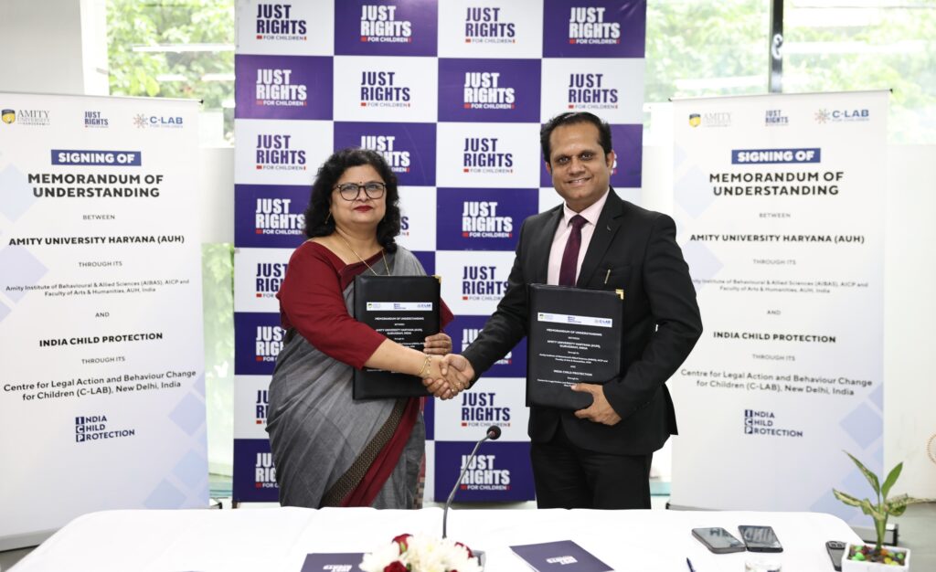 बाल अधिकार, व्यवहार विज्ञान और मानसिक स्वास्थ्य को अकादमिक ढांचे में एकीकृत कर संस्थागत स्वरूप देने के लिए एमिटी यूनिवर्सिटी हरियाणा (एयूएच) और इंडिया चाइल्ड प्रोटेक्शन (आईसीपी) के शोध प्रभाग सेंटर फॉर लीगल एंड बिहेवियर चेंज फॉर चिल्ड्रेन (सी-लैब) ने एक समझौते पर दस्तखत किए हैं। इस समझौते के तहत दोनों पक्ष बाल संरक्षण क्षेत्र में कार्यरत पेशेवरों और कानून प्रवर्तन एजेंसियों के लिए विभिन्न सर्टिफिकेट कोर्स शुरु करेंगे और इसके लिए पाठ्यक्रम व अध्ययन सामग्री भी तैयार करेंगे। साथ ही, दोनों मिलकर बाल संरक्षण से जुड़े विषयों पर शोध और विशेषज्ञता विकसित करने की दिशा में काम करेंगे।