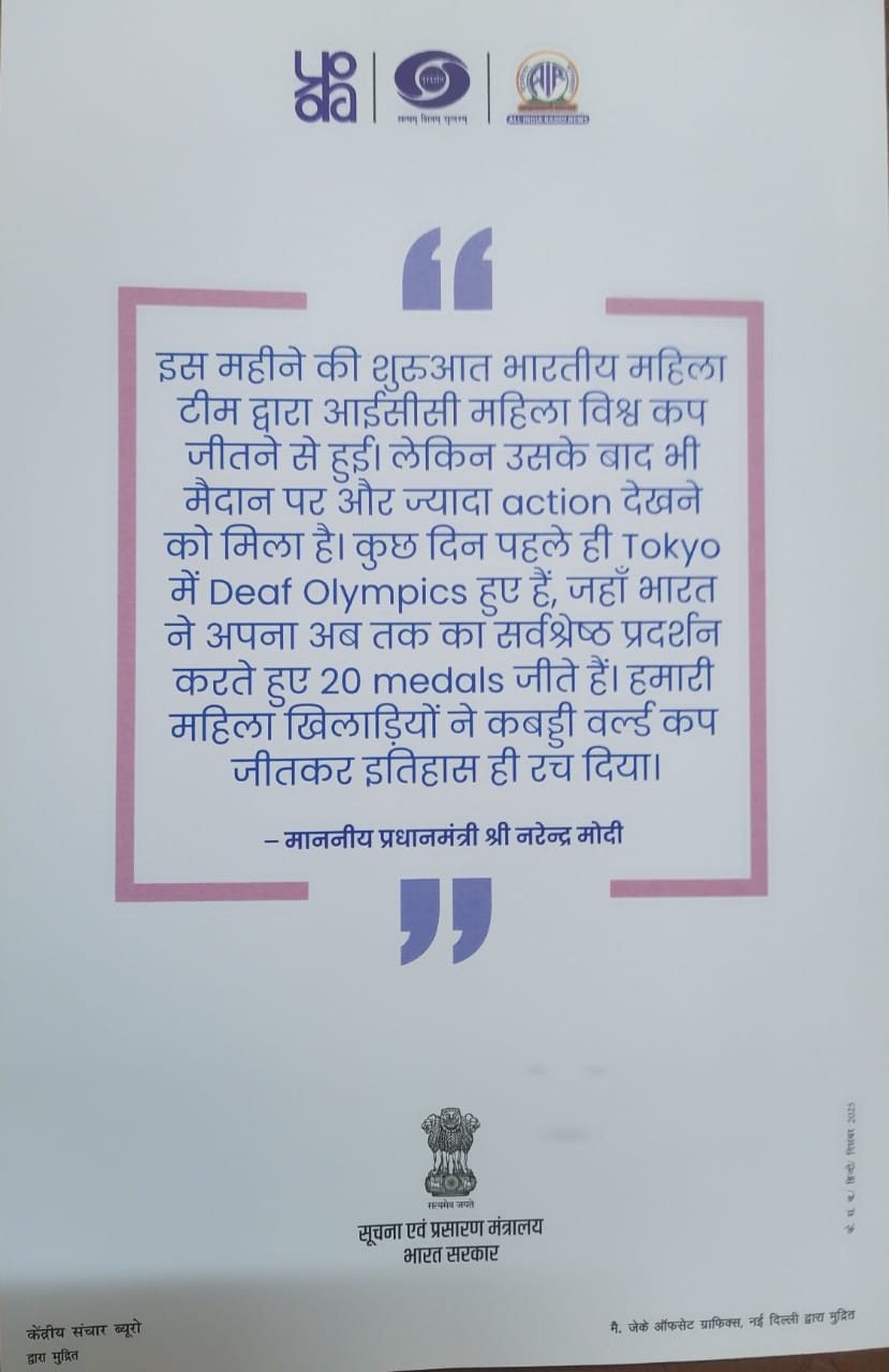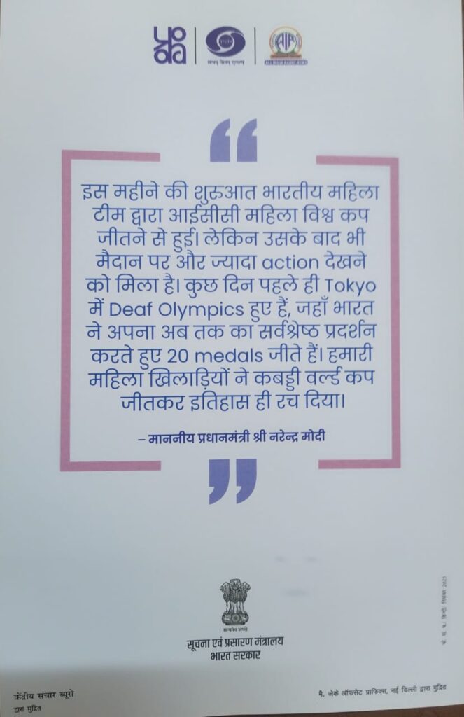 नई दिल्ली, 8 जनवरी। भारत सरकार के सूचना एवं प्रसारण मंत्रालय ने एक सरकारी पुस्तक प्रकाशित की है जिसमें सबसे पीछे देश के माननीय प्रधानमंत्री श्री नरेन्द्र मोदी की ओर से भारतीय महिला टीम द्वारा आई सी सी महिला विश्व कप जीतने की चर्चा की गई है। इसमें सबसे अंत में प्रधानमंत्री की ओर से लिखा गया है कि हमारी महिला खिलाडियों ने कबड्डी वर्ल्ड कप जीतकर इतिहास ही रच दिया। हिन्दी में लिखे गए इस संक्षिप्त वक्तव्य में सिर्फ यही दो वाक्य देवनागरी लिपि में हैं। इनके बीच के वाक्यों में देवनागरी लिपि और रोमन लिपि को मिला कर भाषा की ऐसी खिचड़ी पकाई गई है जिसकी अनुमति भारत का संविधान नहीं देता है !