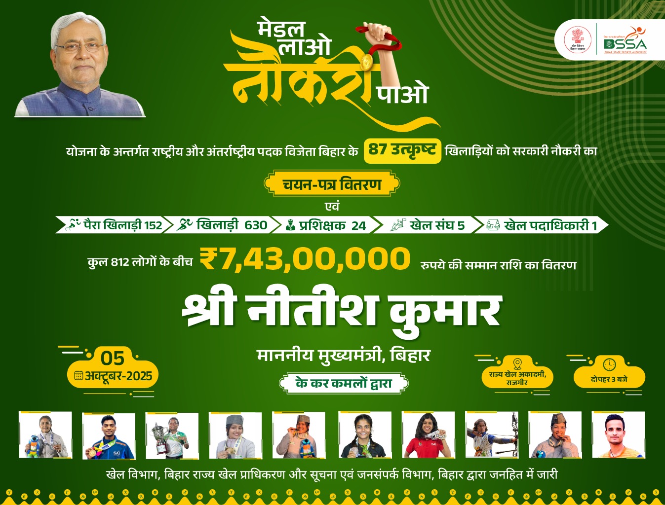 पटना 4 अक्टूबर 2025:- मुख्यमंत्री श्री नीतीश कुमार बिहार के 87 उत्कृष्ट खिलाडियों को सरकारी नौकरी का चयन पत्र और 812 खिलाडियों के बीच करीब 8 करोड़ रुपए की खेल सम्मान राशि का करेंगे वितरण। राज्य खेल अकादमी,राजगीर में एक समारोह में 5 अक्टूबर को होगा यह आयोजन।