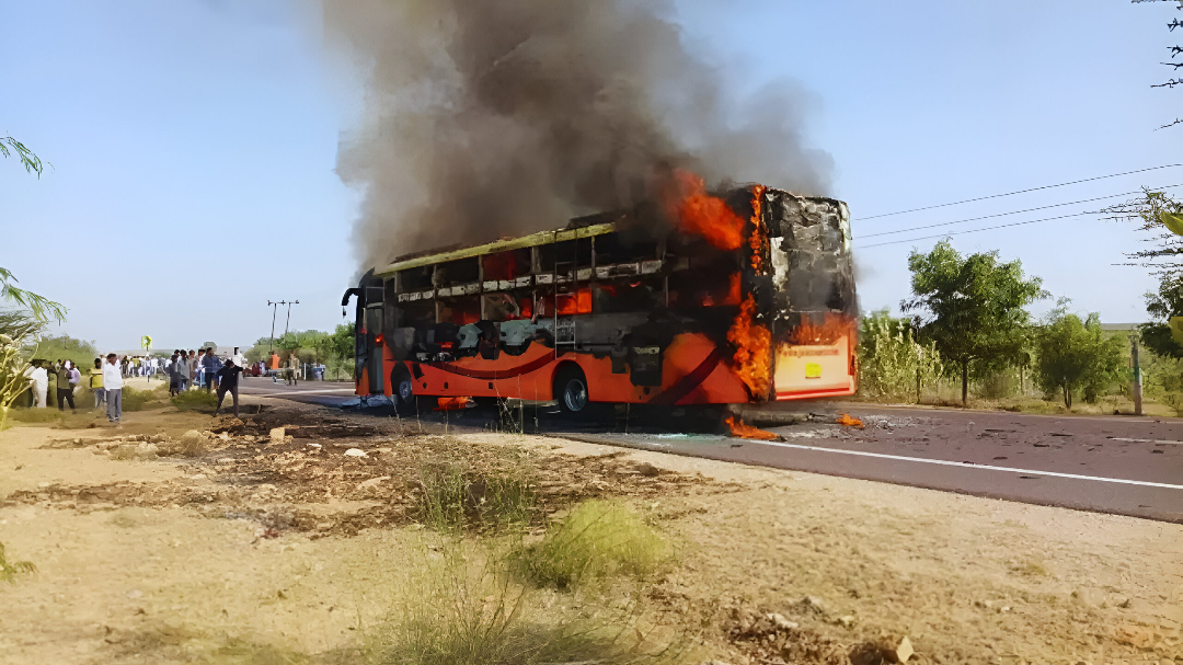 Jaisalmer Bus Fire: राजस्थान के जैसलमेर जिले में मंगलवार को एक भयानक सड़क हादसे में कम से कम 20 लोगों की जान चली गई और 16 यात्री गंभीर रूप से घायल हो गए। हादसा जैसलमेर-जोधपुर हाइवे पर हुआ, जब एक निजी बस 57 यात्रियों को लेकर जोधपुर की ओर जा रही थी। दोपहर करीब 3 बजे बस में अचानक आग लग गई, जिसने कुछ ही मिनटों में पूरे वाहन को आग के गोले में तब्दील कर दिया। आग इतनी भीषण थी कि बस में सवार 19 लोग मौके पर ही जलकर मर गए, जबकि एक यात्री ने इलाज के दौरान दम तोड़ दिया।